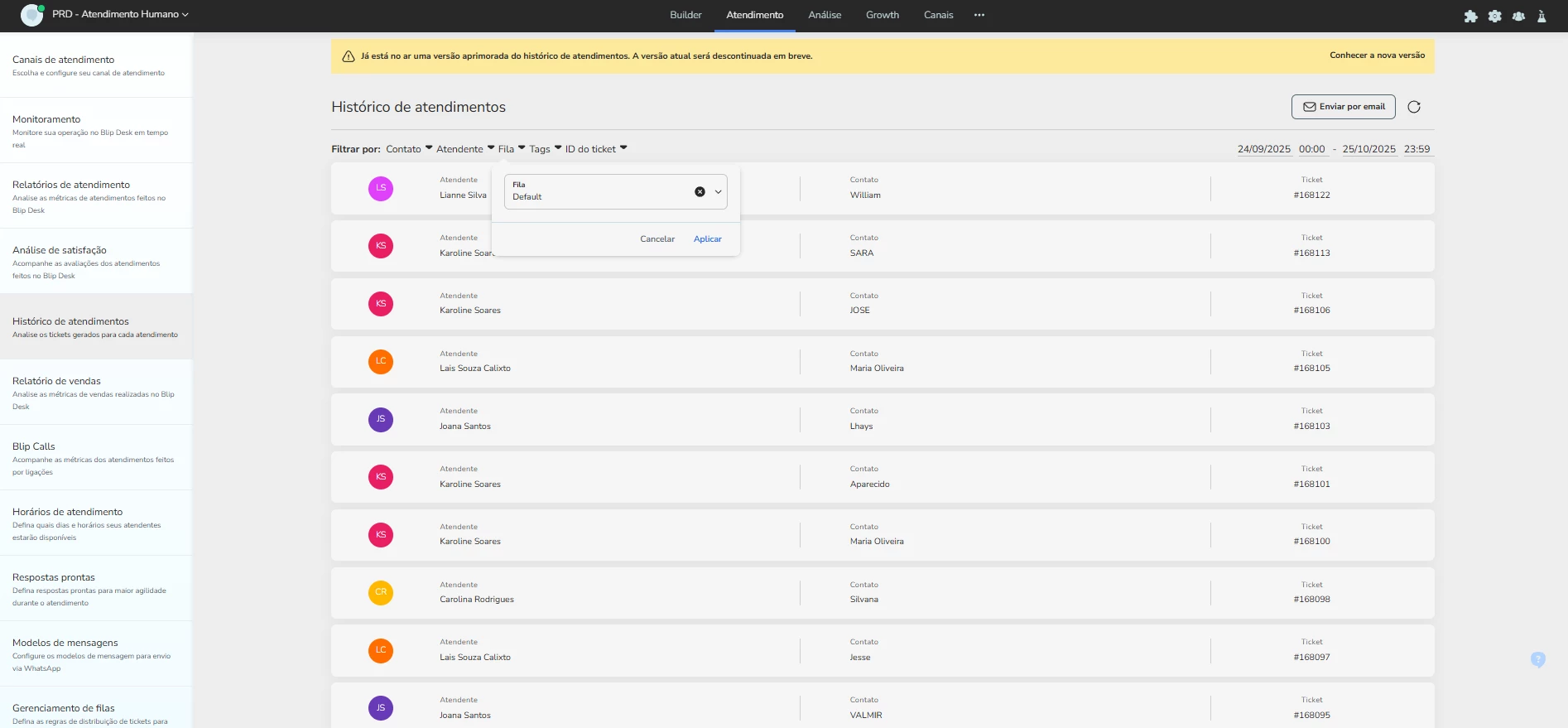 1- Vá até o monitoramento do bot onde fica o bloco “Atendimento Humano” e abra o histórico de algum ticket encerrado da fila Default.
