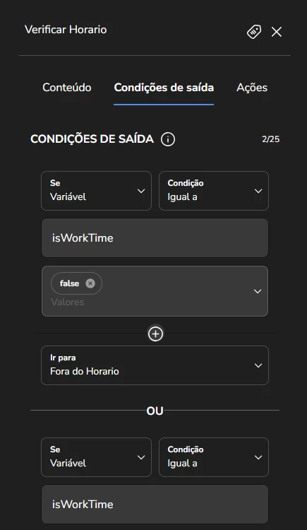 Pesosal, olhei os post que falam sobre o assunto de ter dois horarios, mas em nenhum deles consegui. Eu tenho o atendimento via BLIP das 08: ate as 17 de SEG-SEX e tenho um atendimento via Whatsapp externo, das 08 as 20 de seg a sexta. Como eu posso fazer para separar esses dois horarios? Sendo que pro Whatsapp externo seria so mostrar a mensagem de horario do atendimento e nao mostrar a mensgaem com o link do Whattsapp. É possivel fazer assim?