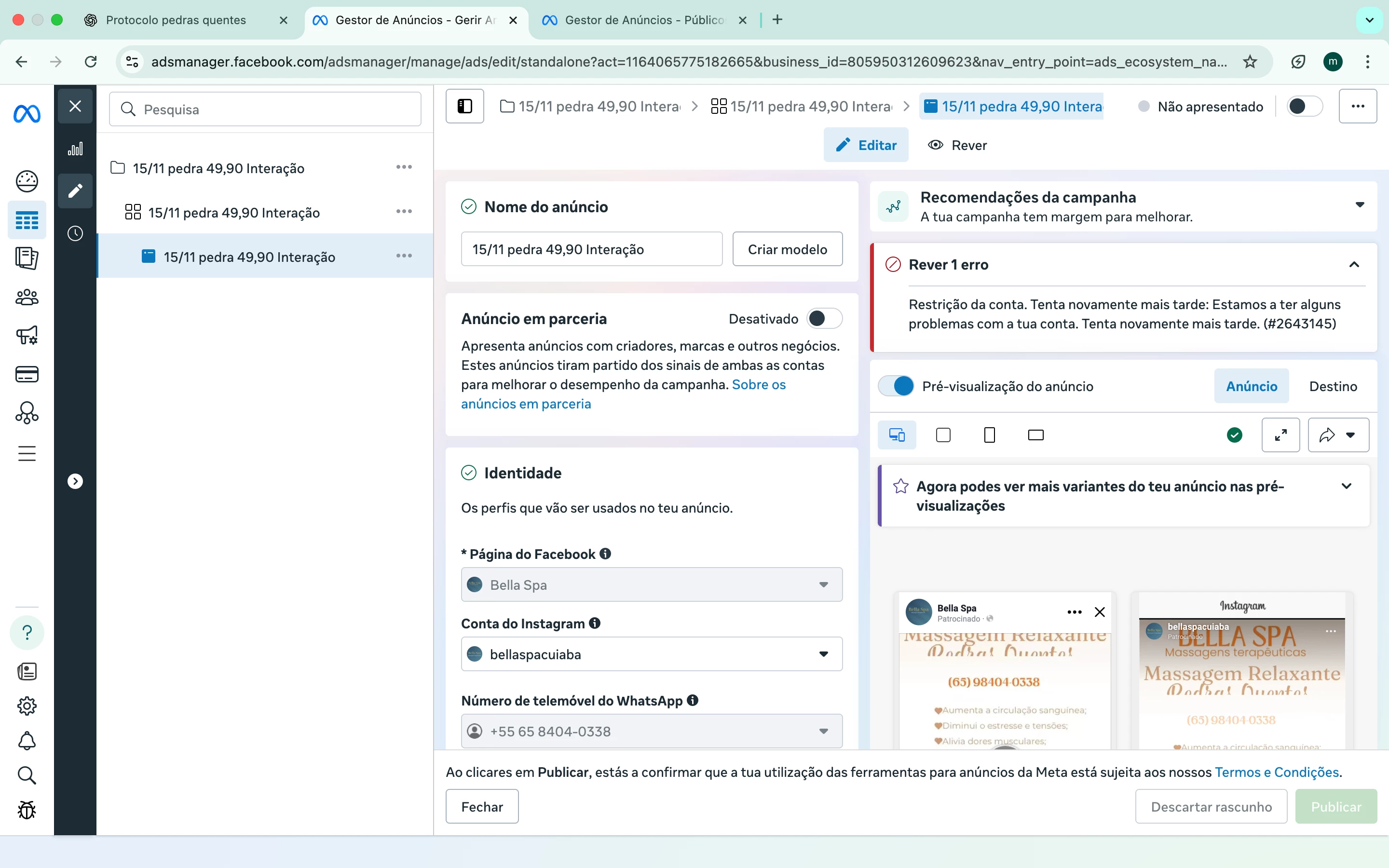 “Rever um erro. Restrição da conta. Tente novamente mais tarde. Estamos a ter alguns problemas com a sua conta. Tente novamente mais tarde. (Erro #2643145)”