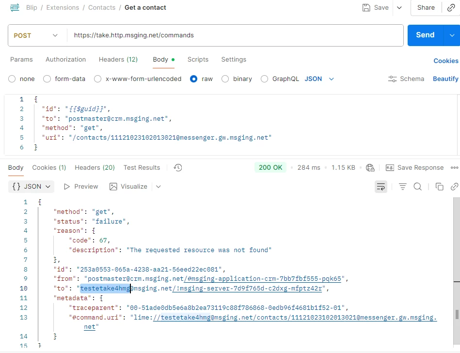 Repare a linha 10 e a linha 13 do retorno do postman isso informa qual é o id do bot vigente ai você sabe se está procurando com dados do router ou do bot builder ai o outro ponto se você for no portal no bot router ir na aba de contato clicar ele vai ter o id na URL ai coloque o id da pessoa na request no meu é a linha 5 do body.