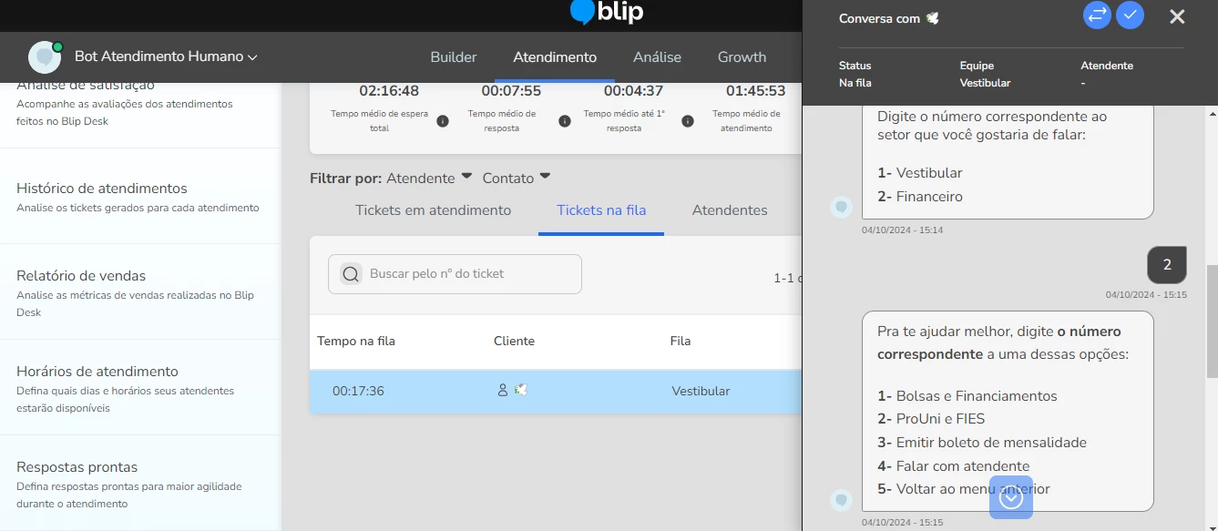 Juntei os setores dentro do bot de atendimento humano porque quando tinha dois sub bots separados de atendimento humano (1 pro vestibular e outro para financeiro) não estavam conseguindo transferir o ticket para outro setor.
