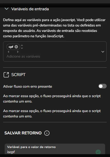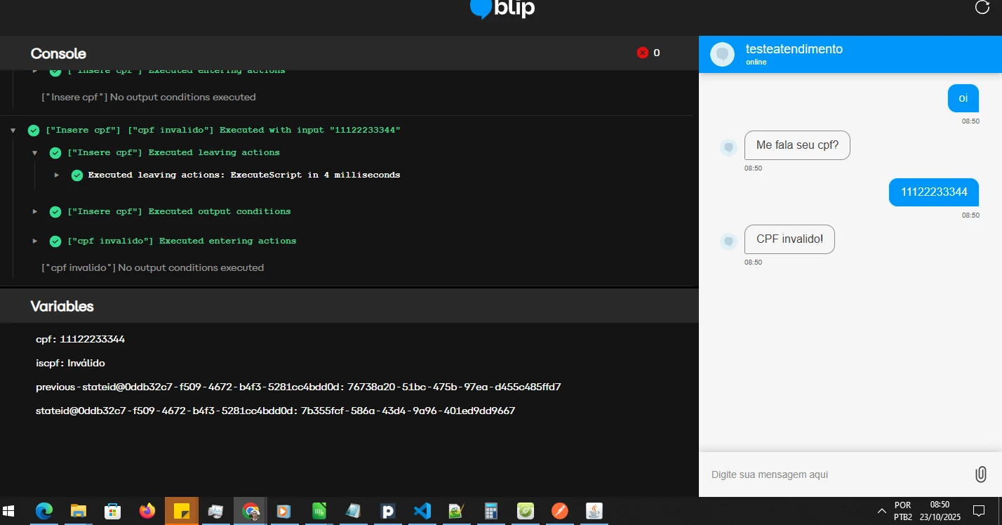 Boa Noite”BLIPERs” , Alguem pode da uma ajudinha aqui , estou tentando criar um Coletador de CPF para identificar os clientes no chatbot , as variaveis foram aplicadas corretamente de acordo com o debuger , mais quando vai validar o CPF o Fluxo nao segue adiante