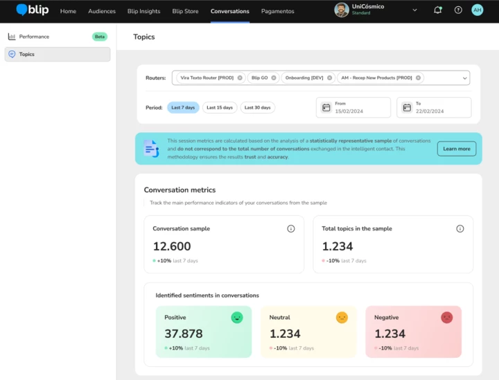 O Conversations representa um grande avanço na observabilidade das conversas dentro da plataforma Blip, em todos os fluxos (incluindo o Studio). Ele usa IA para analisar diálogos e convertê-los em dados estratégicos, gerando insights reais.