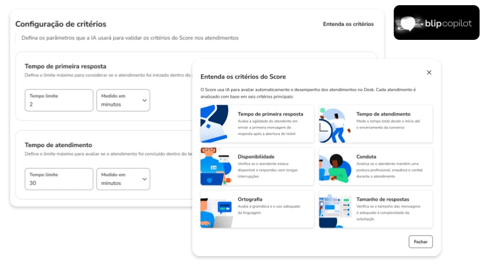 Agora, no menu Blip Copilot, o usuário pode configurar os tempos (TMA e T1R) que a IA deve considerar na avaliação dos atendimentos. Isso remove os gargalos do processo anterior.