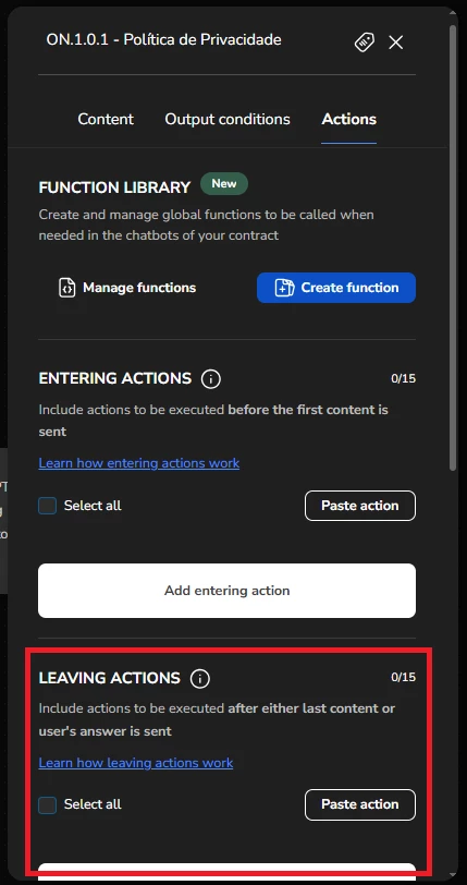 Como nossa reação e/ou typing será incluída referenciando um input do usuário, a ação deve ser incluída num local onde ela seja executada após a inserção do input. Sendo assim, o local ideal é nas Ações de Saída de um bloco onde você aguarda o input do usuário.