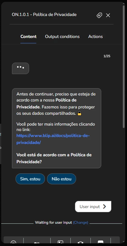 - Tempo do typing: Conforme a documentação da Meta, o “digitando…” desaparecerá assim que outra mensagem for enviada, ou após 25 segundos, o que ocorrer primeiro. Nesse sentido, pode ser interessante aumentar o tempo de resposta dos conteúdos no Builder/Studio.
