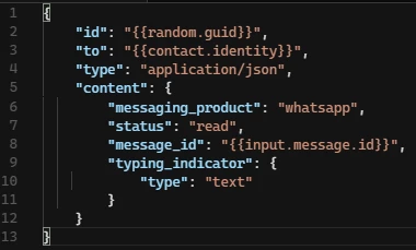 O corpo da requisição será um JSON contendo o objeto de typing ou reaction, seguindo a estrutura da API da Meta e utilizando variáveis da biblioteca Blip para referência.