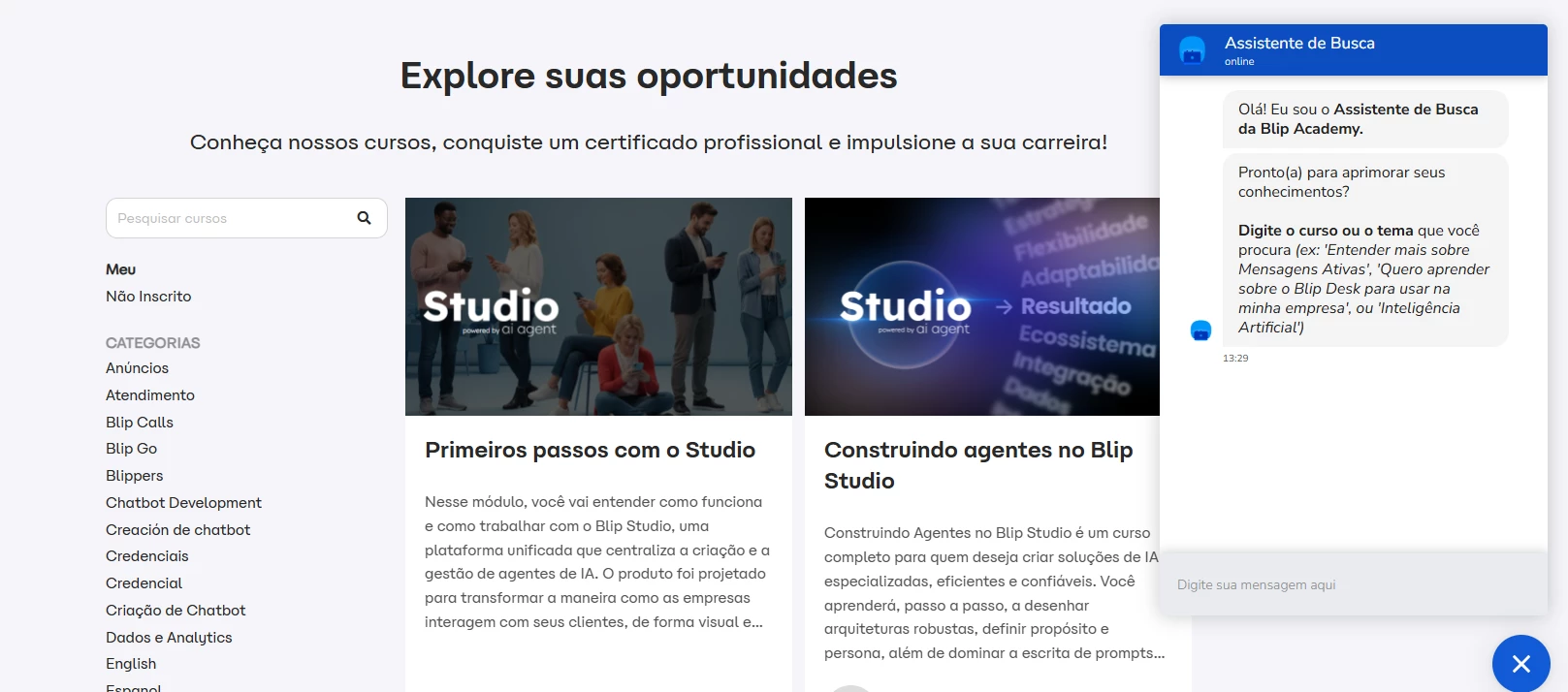 Acesse a Blip Academy > clique no Assistente no lado direito da tela > busque por "Blip Studio”.