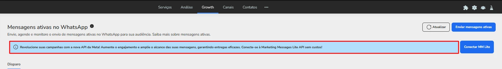 Porque, pelo que vi, o envio de Mensagens Ativas continua exatamente igual! O material nos dá a entender que esses “benefícios” estariam disponíveis diretamente no portal do Blip após a migração abaixo: