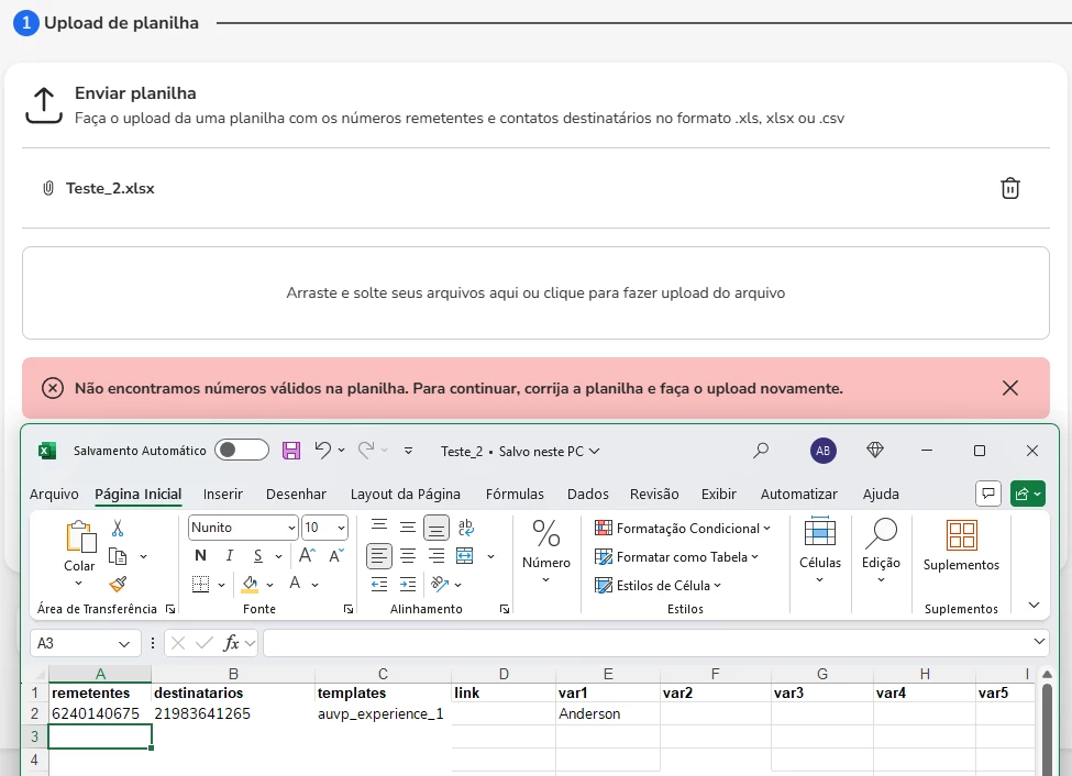 Estou tentando realizar disparo em massa através do Go Personal. fiz um teste conforme imagem abaixo e está apresentando erro sem reconhecer número: