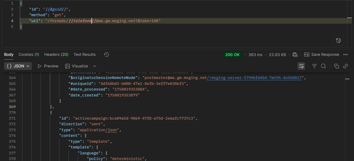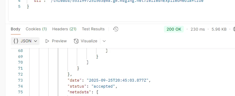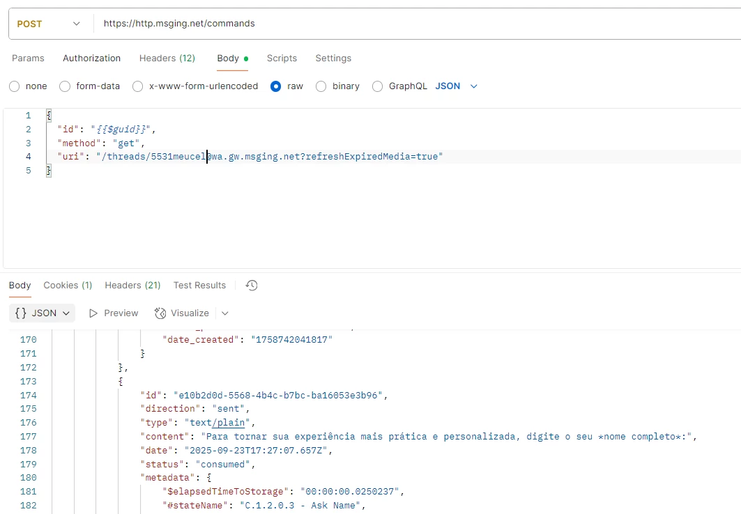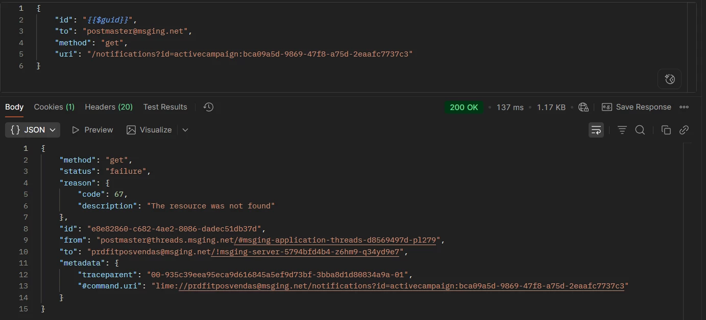 Estou tentando usar a rota, porém sempre retorna “The resource was not found”. Estou passando o id e o #messageId dentro de Metadada (informações que vem na rota get last messages) e em nenhum dos dois casos da certo.